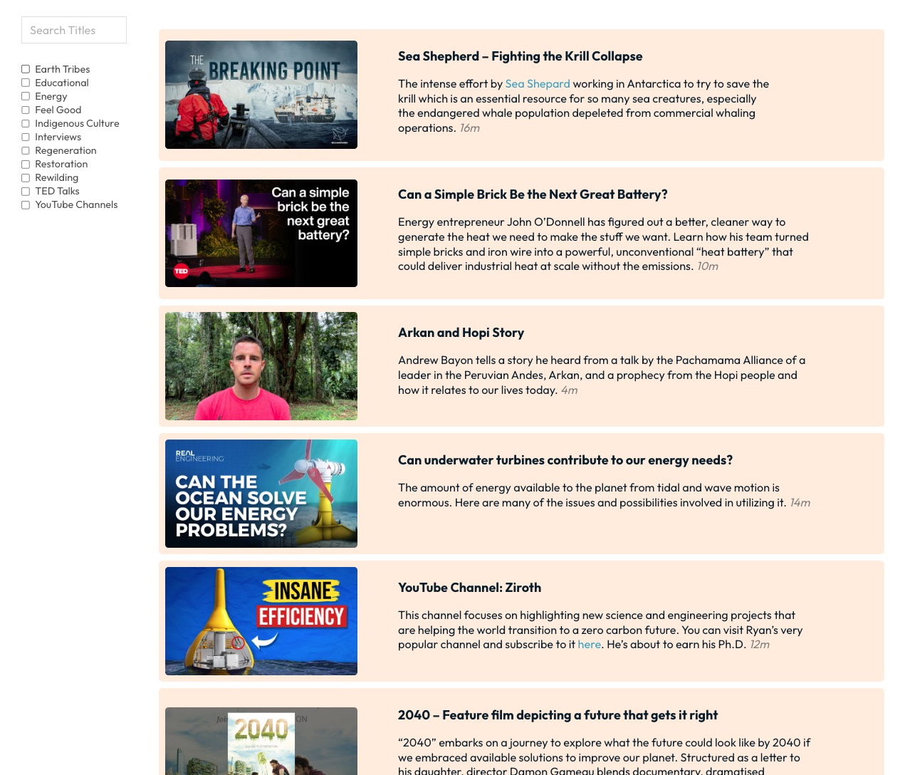 Our Theater is a key component of the Continuous Climate Conference. Featured videos are anywhere from short clips, talks and stories to feature films, all hand-selected by members of this community.